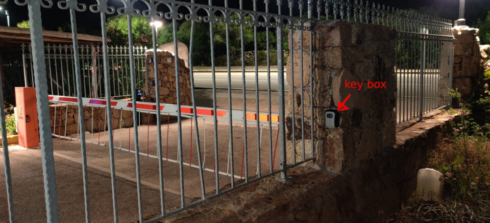 Essa è installata in modo da non essere visibile dalla strada. Dovrete pertanto entrare nel parcheggio pubblico, camminare fino al cancelletto pedonale, girarvi verso la strada e, accanto alla sbarra, potrete vedere la key box. Una volta terminato il vostro soggiorno vi preghiamo di rimettere le chiavi nella key box.